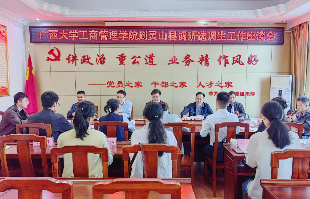 为贯彻落实学校党委关于选调生工作的决策部署,推动“君武青苗”行动,10月22日,工商管理学院党委书记黄晋带队赴灵山县、浦北县走访调研选调生工作,校校友办副主任黄庶冰、院党委副书记肖克宁、组织员黄照温、校学生工作部王天亮参加调研。浦北县委常委、组织部部长钟远才、灵山县委组织部副部长黄静文出席并分别主持座谈会,在灵山县、浦北县工作的19名选调生校友参会交流。
