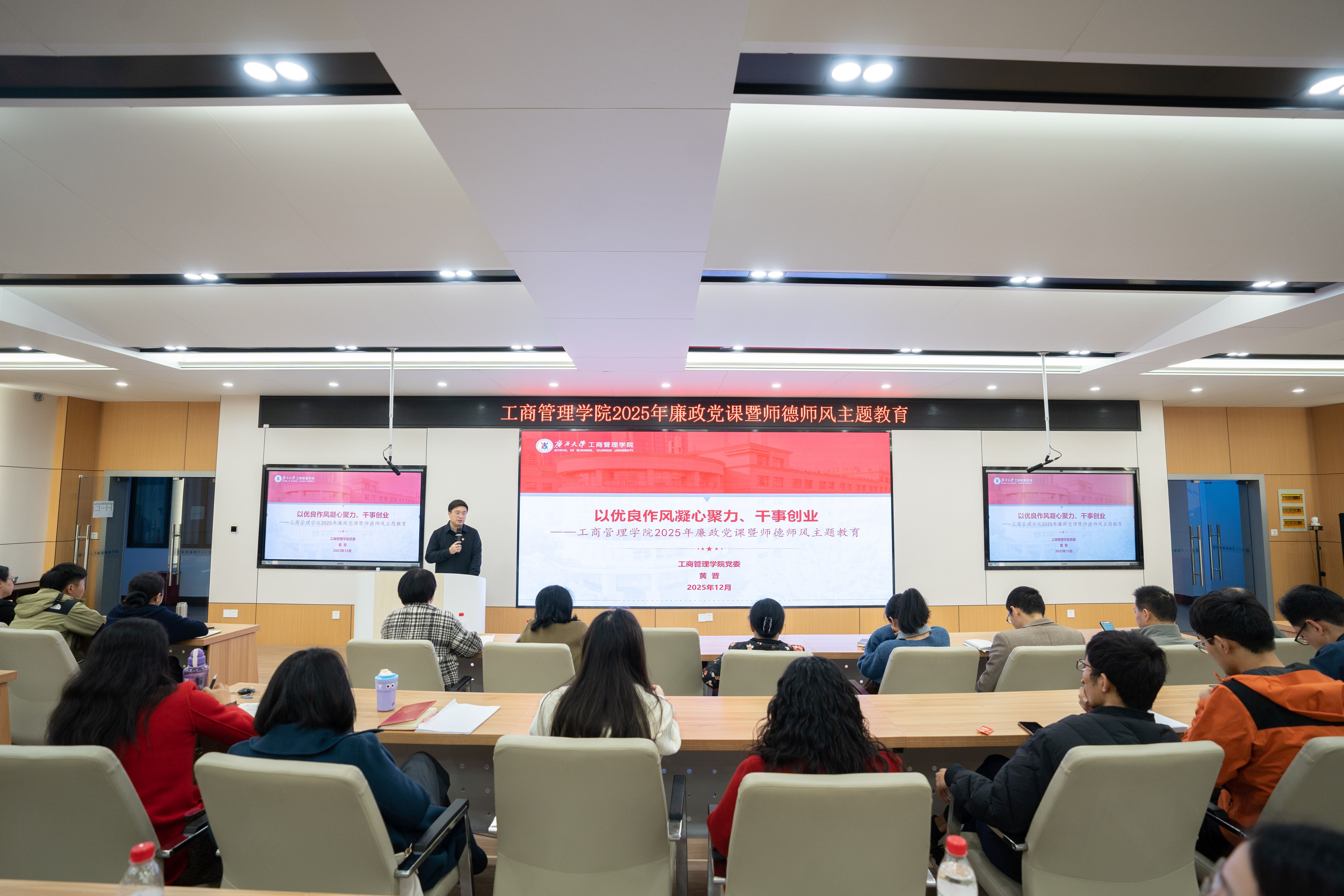 12月16日下午,学院在122教室开展2025年廉政党课暨师德师风主题教育,由学院党委书记黄晋主讲,全院教职工参加。