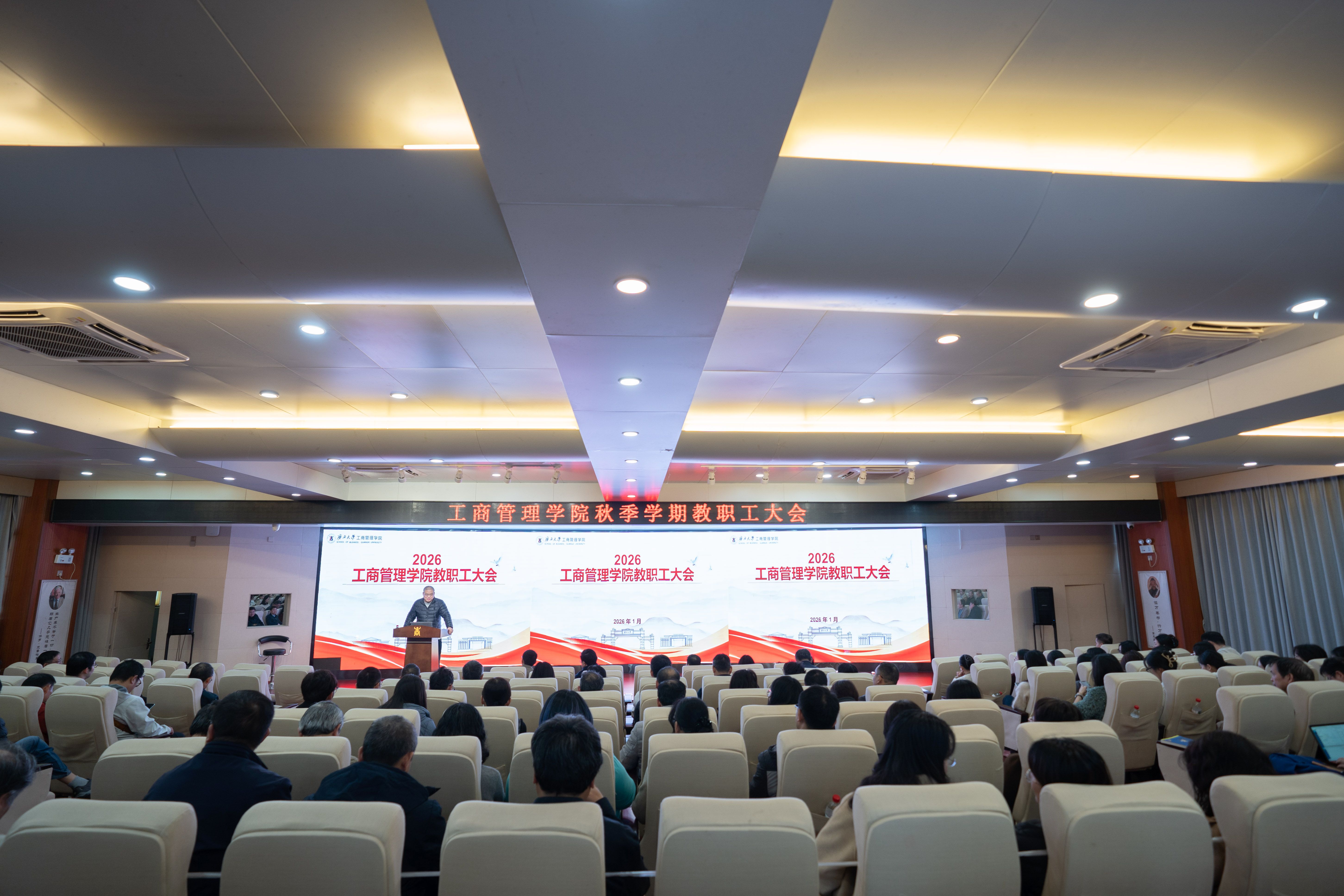 1月13日下午,我院在128报告厅召开期末教职工大会,全面总结2025年发展成效,系统部署2026年重点工作。学院党委书记黄晋、院长朱帮助、党委副书记肖克宁,副院长申韬、廖东红、韦铁,院长助理蒋侃出席会议,全体教职工参加了会议。 -