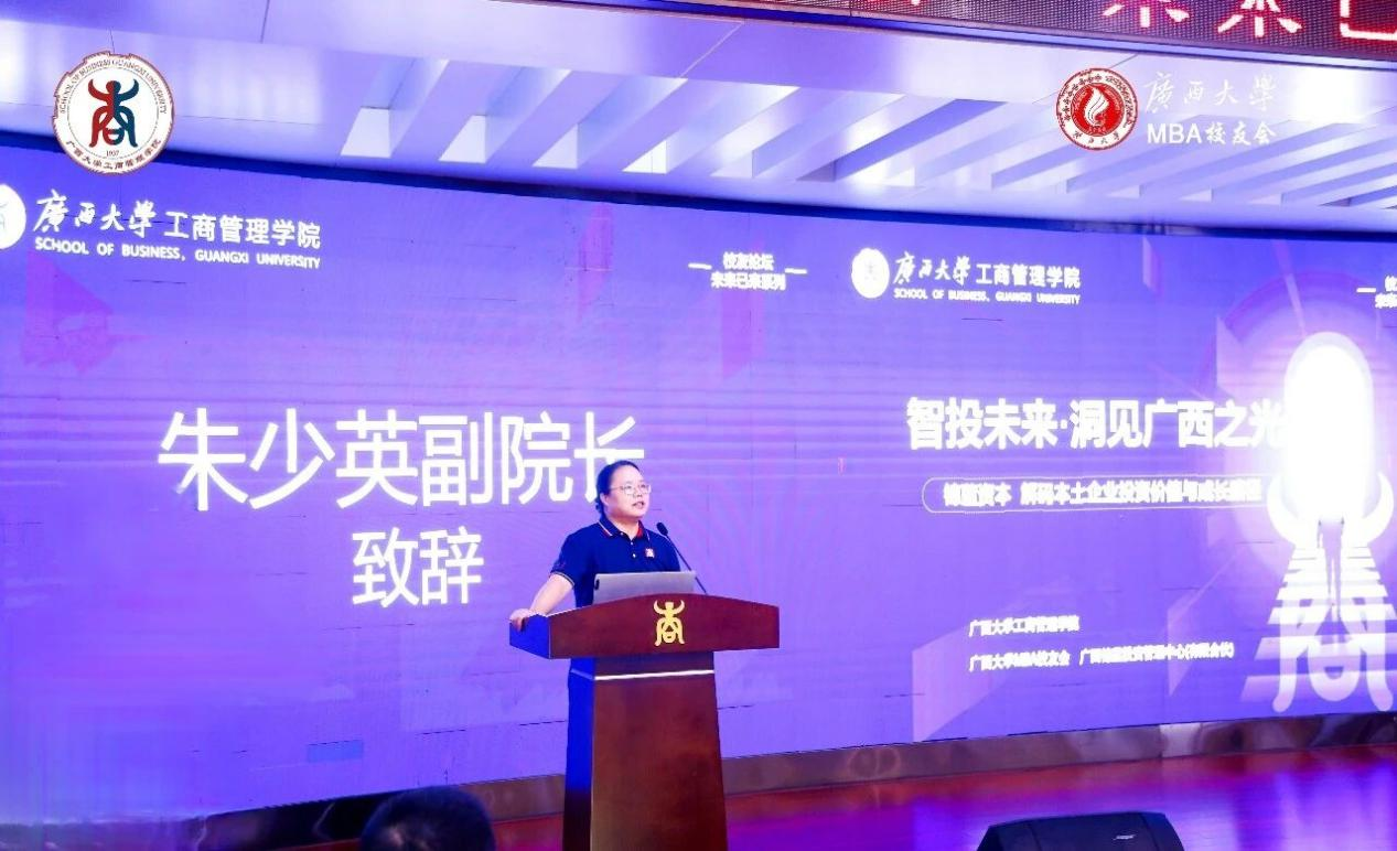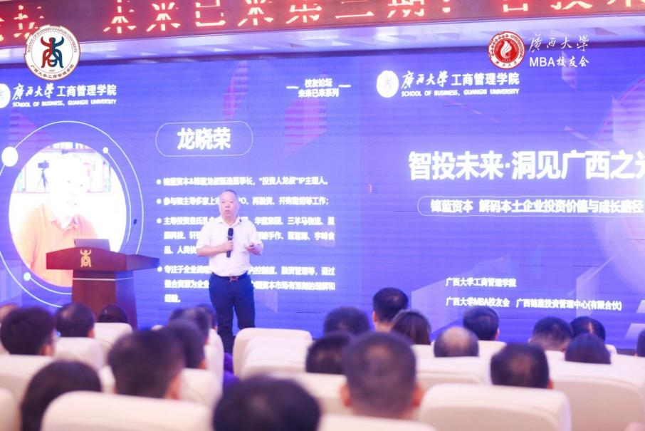 近日,由广西大学工商管理学院与广西大学MBA校友会联合主办的主题为“智投未来・洞见广西之光”“未来已来”校友论坛第三期在我院128报告厅举行。活动特邀锦蓝资本创始人、“投资人龙叔”IP主理人龙晓荣担任主讲嘉宾,聚焦资本赋能与广西产业发展,与师生校友展开深度交流。学院副院长朱少英,广西大学校友工作办公室副主任陈懿,MBA校友会会长贺忠、执行会长李翔等出席活动,EMBA、MBA、SMBA、EDP及学院其他校友百余人参与活动。