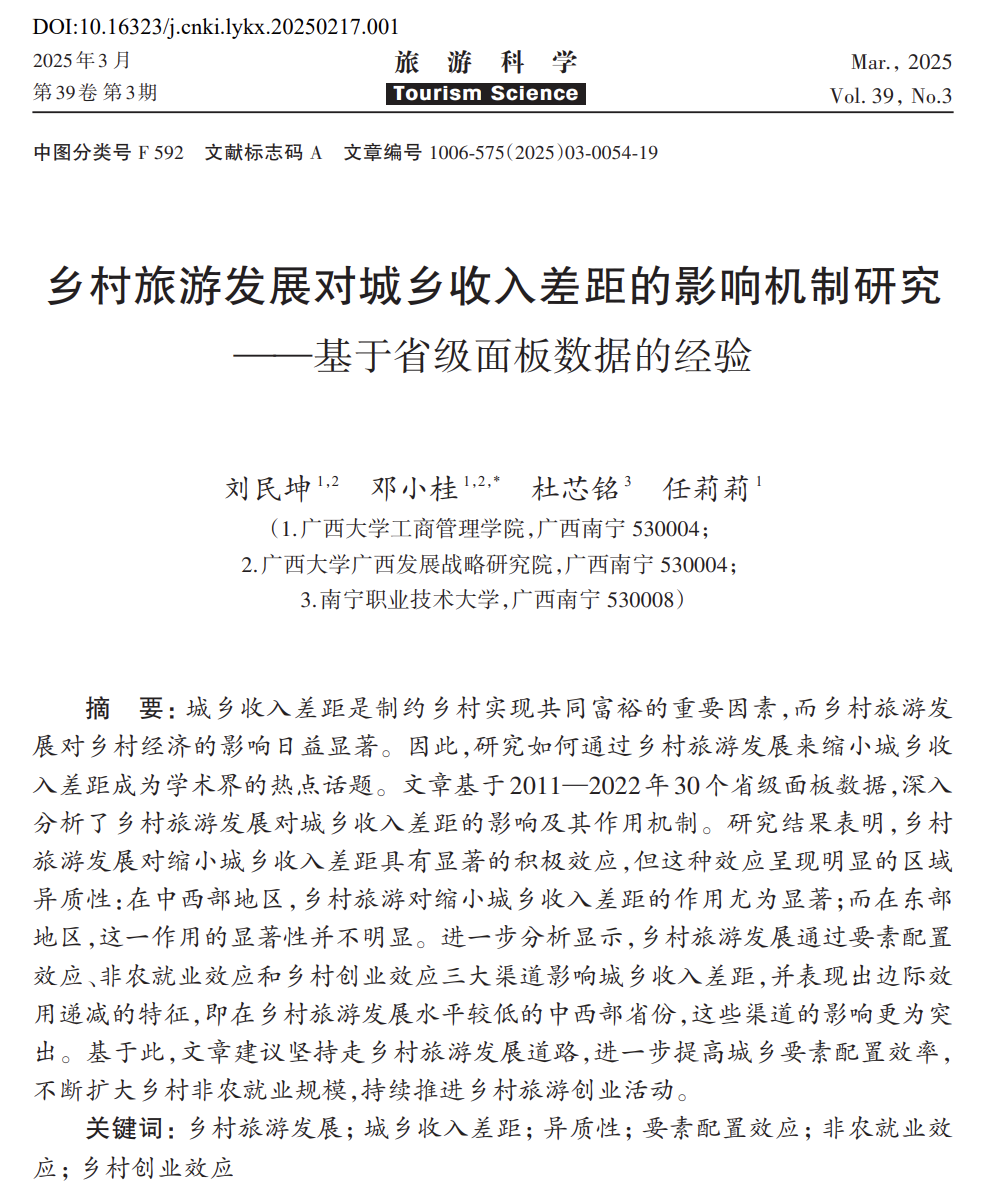 近日,我院刘民坤教授科研团队在乡村旅游与城乡发展领域取得新进展,研究成果以《乡村旅游发展对城乡收入差距的影响机制研究——基于省级面板数据的经验》为题,在旅游管理领域高水平期刊《旅游科学》2025年第3期发表。刘民坤教授为第一作者,邓小桂、杜芯铭、任莉莉等共同参与研究,广西大学工商管理学院为第一单位和通讯单位。