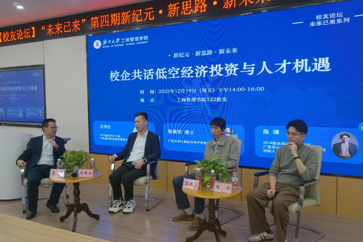 12月19日下午,学院122教室内暖意融融、智慧涌动,“未来已来”系列校友论坛第四期在此举行。本次论坛以“新纪元·新思路·新未来——校企共话低空经济投资与人才机遇”为主题,围绕低空经济在广西的发展路径规划、投资机遇挖掘与人才培育创新模式展开深度交流。论坛由学院校友工作与政企服务办公室主任覃朝勇主持。