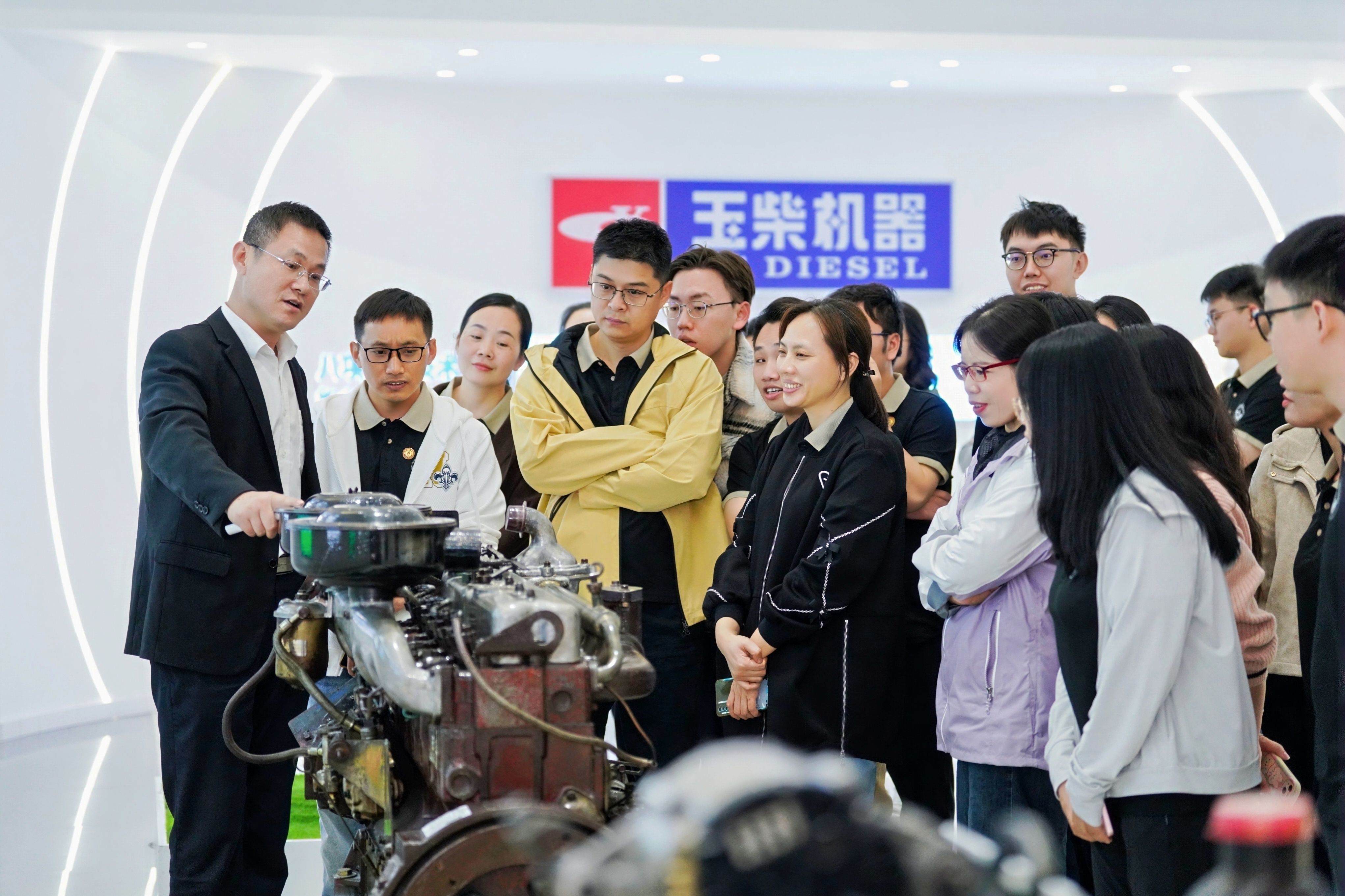 在玉柴芯蓝的科技展厅,展示着增程动力、混合动力、燃料电池、纯电驱动系统四大新能源动力系统平台产品,。实验车间里,环境模拟舱能在短时间内模拟从-40℃严寒到85℃高温的极端循环,在此环境下连续稳定运行200小时以上的待测产品才能量产。通过参观,同学们对玉柴芯蓝在新能源动力系统领域深耕18年,拥有专利累计超300项的前瞻性布局与技术储备有了直观了解。