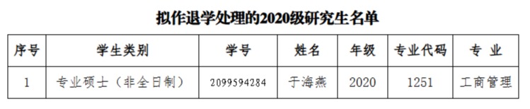 根据《普通高等学校学生管理规定》(中华人民共和国教育部41号)第三章学籍管理 第五节退学,和《广西大学研究生学籍管理规定(2020年修订)》(西大研〔2020〕23号)第七章退学相关规定,以及广西大学研究生院2025年关于开展研究生学籍清查工作通知的要求,经学院党政联席会议审议,拟给予以下同学退学处理。现予以公示,公示期为5个工作日(2025年10月20日至10月25日)。在公示期内,如有异议,请以书面形式并署真实姓名和联系方式,向工商管理学院研究生办公室反映,联系电话:(0771)3235116。