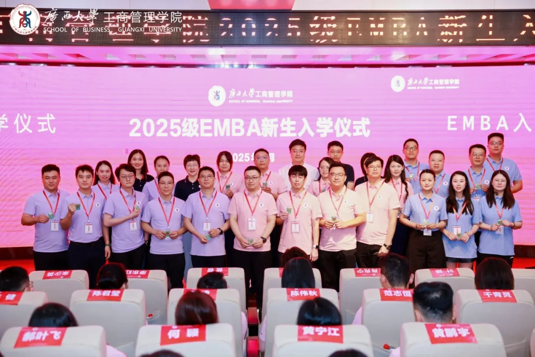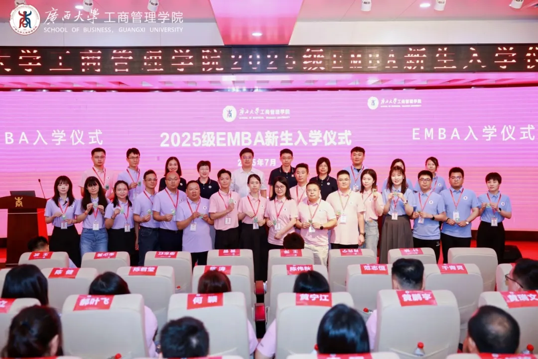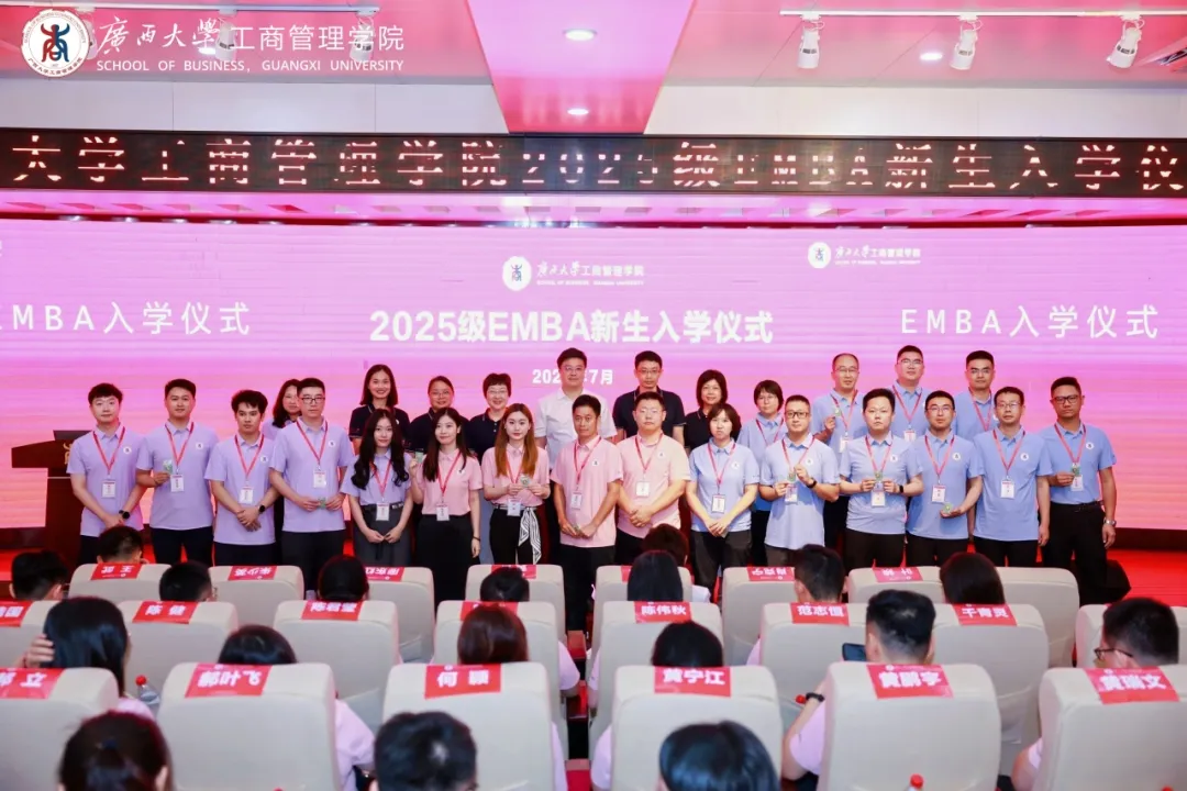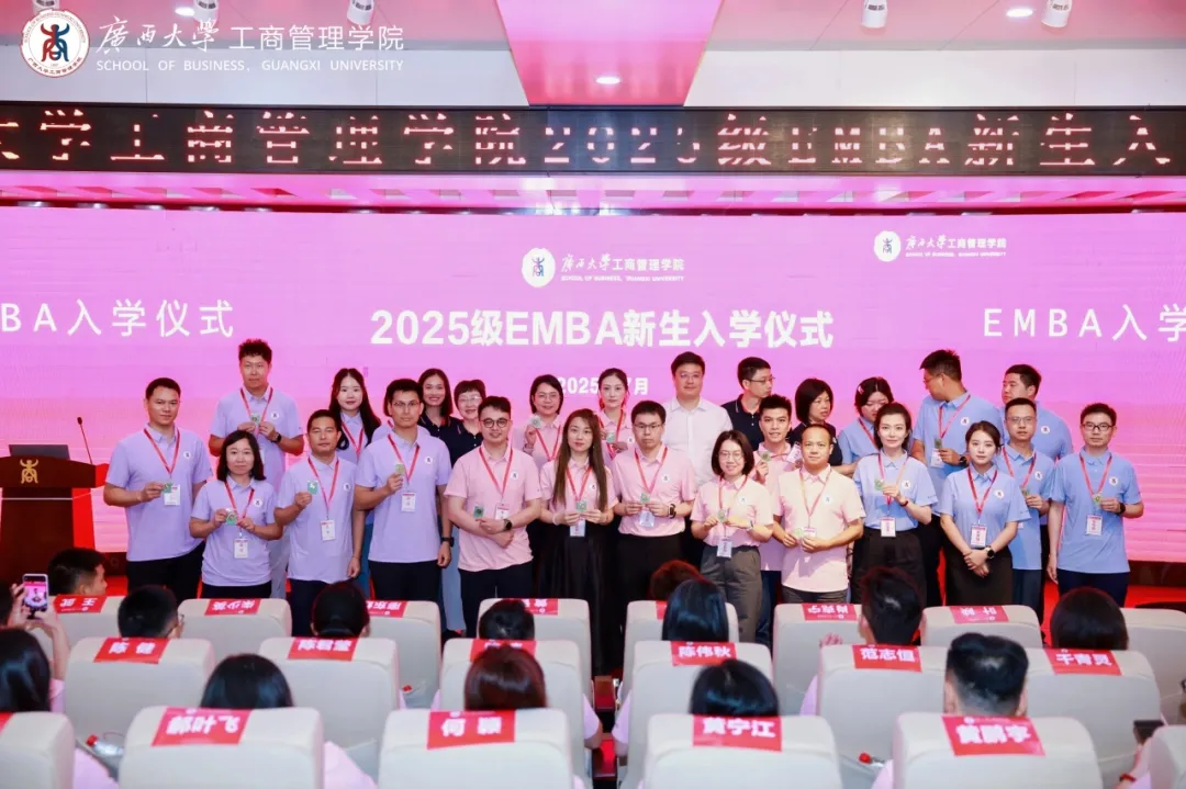 7月6日上午,广西大学工商管理学院2025级EMBA新生入学仪式在学院128报告厅隆重举行。全国工商管理专业学位研究生教育指导委员会秘书处办公室主任、中国学位与研究生教育学会工商管理专业学位工作委员会秘书长王萍、工商管理学院党委书记黄晋、党委副书记肖克宁、副院长廖东红、研究生管理中心主任叶映、EMBA教育中心主任宁雪莲出席了仪式,仪式由副院长朱少英主持。