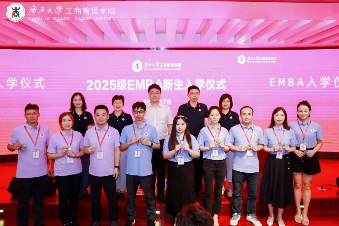 入学仪式是广西大学EMBA开学活动中重要的一个仪式。在这个仪式上,广西大学工商管理学院的领导们为各位同学佩戴广西大学EMBA学员证,赠送广西大学校徽。