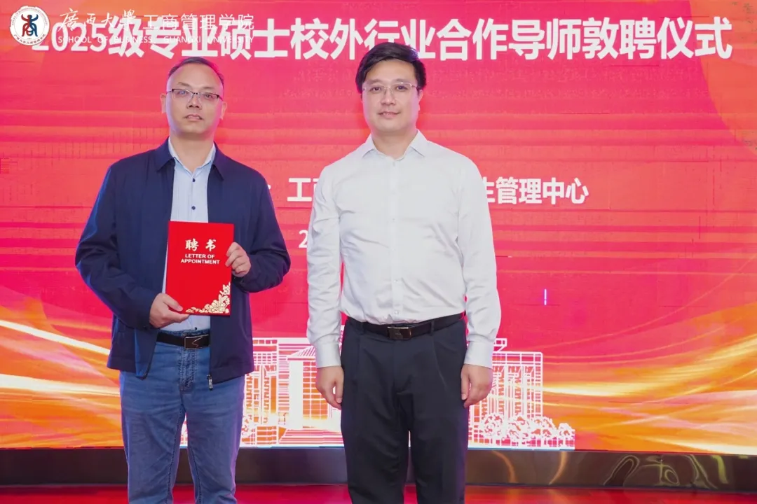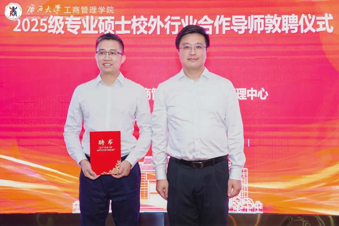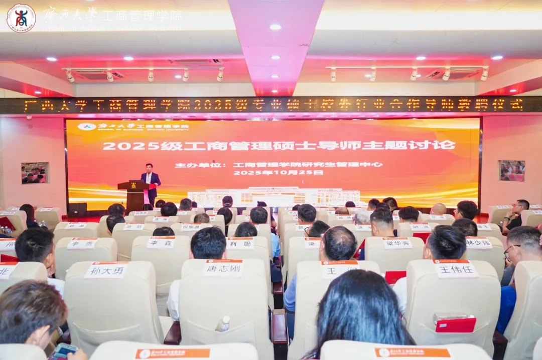 2025年10月25日,广西大学工商管理学院在学院内隆重举办了“2025级专业硕士校外行业合作导师敦聘仪式”。本次活动旨在进一步加强校企合作,推动产学研深度融合,提升专业硕士培养质量,为学生搭建更广阔的职业发展平台。仪式吸引了众多校外行业合作导师、校内教师及学生参与。