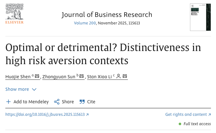 近日,我院助理教授沈华杰与香港城市大学Stan Xiao Li教授、Zhongyuan Sun博士生在最优区分战略领域研究取得新进展,研究成果《Optimal or detrimental? Distinctiveness in high risk aversion contexts》在管理学高水平期刊《Journal of Business Research》网络首发。我院助理教授沈华杰为第一作者,广西大学工商管理学院为第一单位。