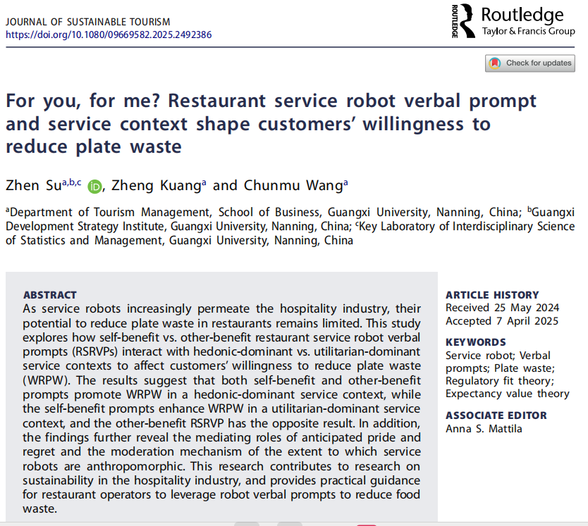 近日,我院苏振副教授及硕士研究生匡政、王春木在人工智能与旅游可持续发展领域研究取得新进展。研究论文以《For you, for me Restaurant service robot verbal prompt and service context shape customers’ willingness to reduce plate waste》为题在旅游管理高水平国际期刊《Journal of Sustainable Tourism》发表。苏振副教授为第一作者,广西大学工商管理学院为第一单位。